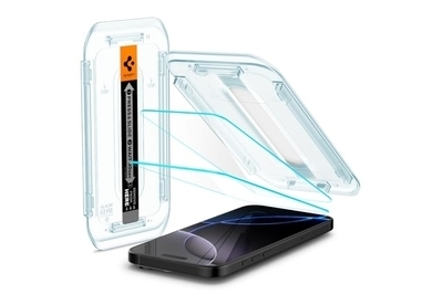 Applying this screen protector is extremely easy. Newer-model iPhones, including the 13, 14, 15, 16, and 17, have edge-to-edge displays without a Home button to help align the protector, so an alignment tool is essential for good installation. Spigen’s screen protector installation is the absolute best we’ve found, and the included visual instructions make the process clear. Each box includes two plastic installation trays, with the glass already in place. Once you’ve cleaned your phone’s screen with the included alcohol wipe, dry wipe, and dust-removal sticker (if necessary), you peel off the backing from the screen protector and snap the frame onto your phone. This design ensures that you can’t misalign the glass. The instructions guide you to press and slide along a sticker on the front of the protector and then remove the frame.